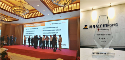 東莞市同舟化工有限公司獲得塞拉尼斯頒發的“100周年合作紀念獎”,獲得該獎項的還有揚子石化-巴斯夫有限責任公司、巴斯夫(中國)有限公司、立邦投資有限公司、阿克蘇諾貝爾太古漆油(上海)有限公司等共計十四家全球知名企業。